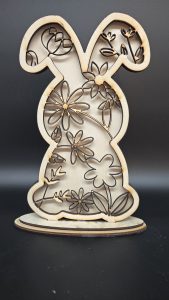Dieser Blumenhase ist eine Multilayer Figur und besteht aus 3 Schichten Holz mit Blumenmuster