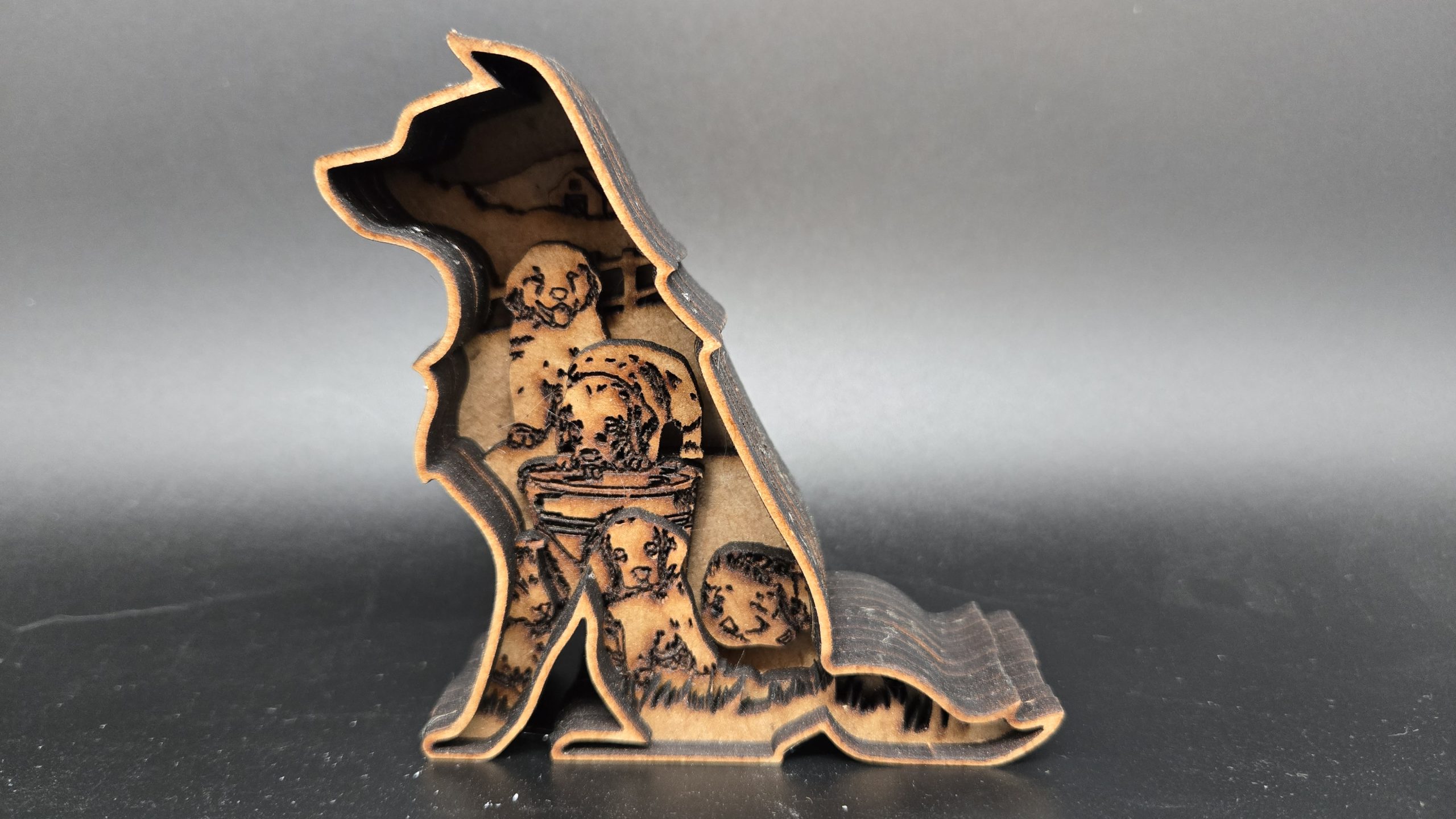 Eine Multilayer Figur aus 5 bis 7 Schichten Holz verleimt. Die Figur zeigt den besten Freund des Menschen und eine Ansicht einer Landschaft mit Hunden. Die Figur ist ca. Größe A4